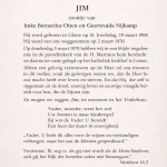 (Familiedrama, noodlottig ongeval) Jim werd op maandag 2 maart 1970 levenloos gevonden in de Dinkel door een postbode in Glane. Al snel werd duidelijk dat hij was verdronken, ook door de koude tempraturen. De oorzaak was dat Jim door het tuinhekje dat open stond naar het water was gelopen en waarschijnlijk er toen is in gevallen. Wie hiervoor verantwoordelijk is, is een raadsel, maar de familie heeft in stilzwijgen altijd Tieme (opa) verdacht. Een volledige oorzaak zou nooit meer gevonden kunnen worden helaas.